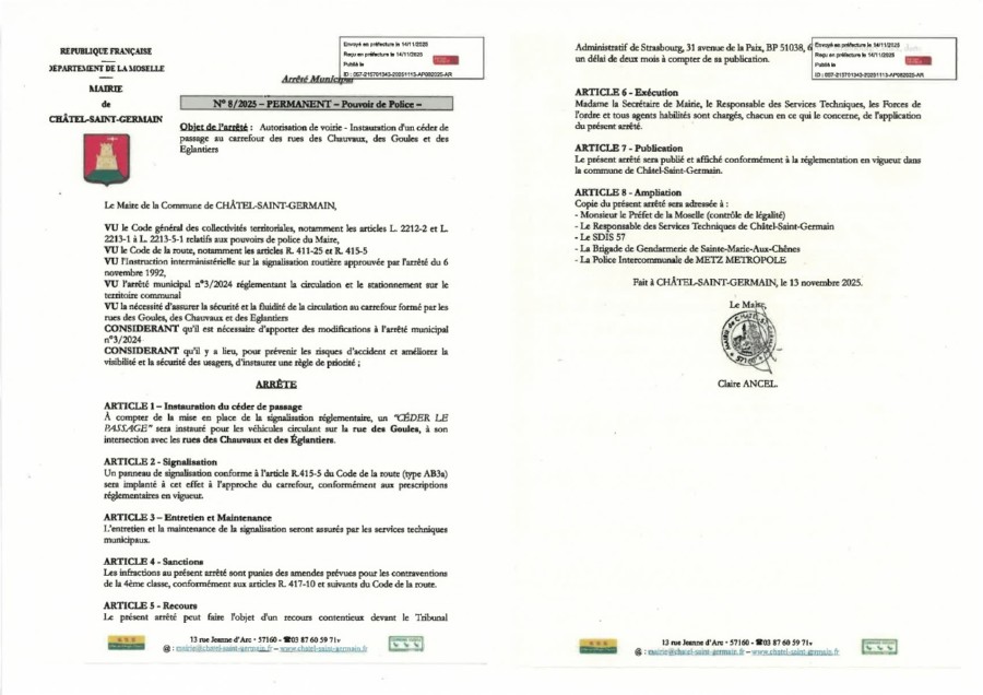 ARRÊTÉ PERMANENT instaurant un « céder le passage » au carrefour des rues des Chauvaux, des Goules et des Eglantiers.
