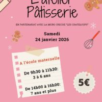 La municipalité proposent avec la collaboration de la micro crèche 2 ateliers pâtisserie pour les enfants, le SAMEDI 24 JANVIER 2026 à l’école primaire Marie Marvingt.
