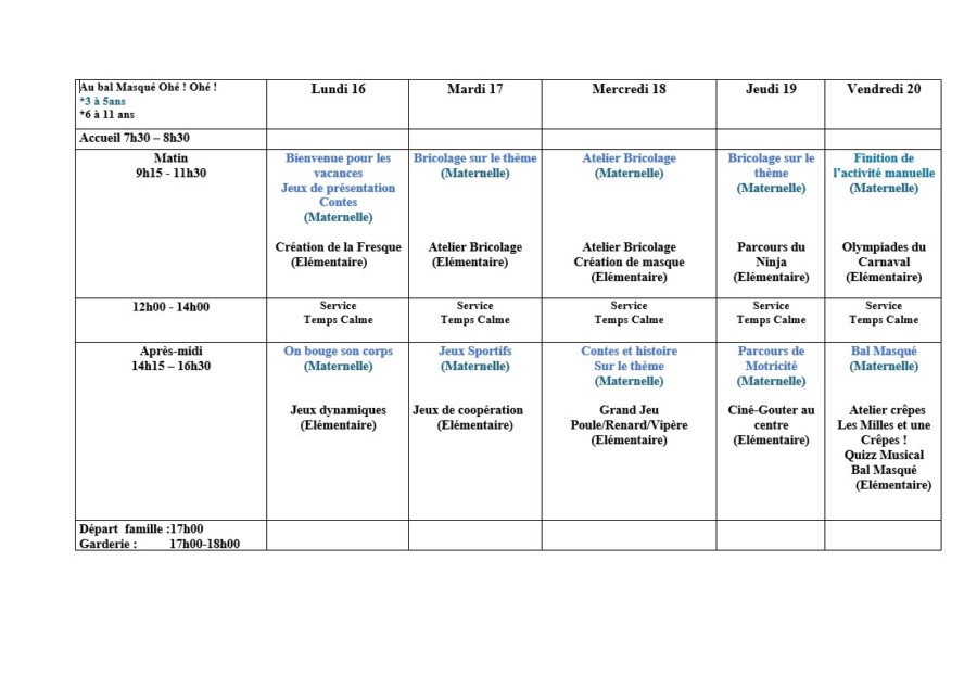 Semaine de centre aéré du lundi 16 au vendredi 20 février 2026.
